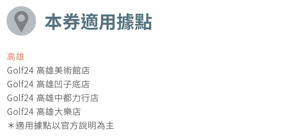 1. 本券不分平假日可於【GOLF24室內高爾夫】兌換使用高雄任一分店3小時體驗乙次,不可分次使用,最多4人(含)入場。