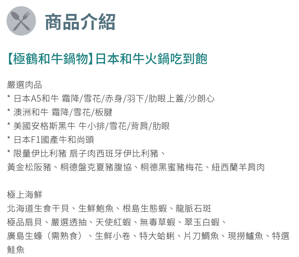 • 本票券可兌換【極鶴和牛鍋物】日本和牛火鍋吃到飽乙份。