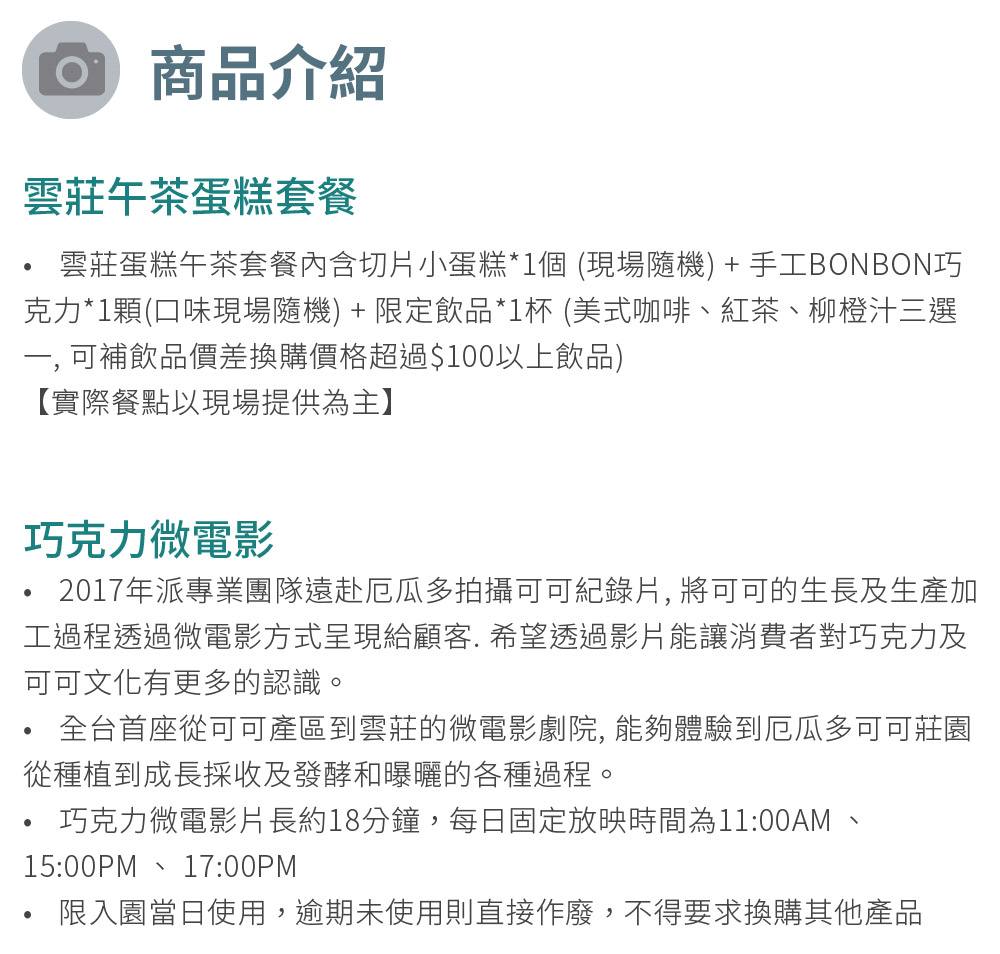 2.本專案可觀看巧克力微電影(片長約18分鐘,每日固定放映時間11AM、15:00PM、17:00PM)(限入園當日使用,逾期未使用則直接作廢,不得要求換購其他商品) 。