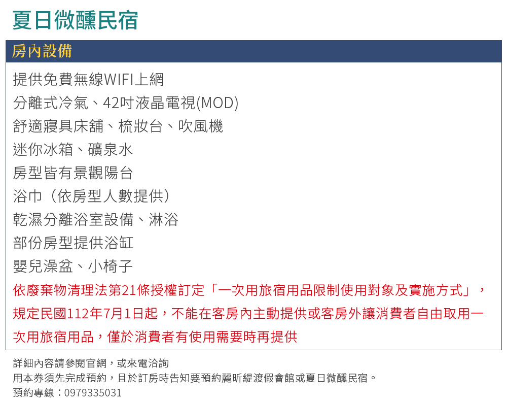 1.單張可兌換墾丁恆春【麗昕緹渡假會館/夏日微醺民宿】四人房住宿券 (MO) 。