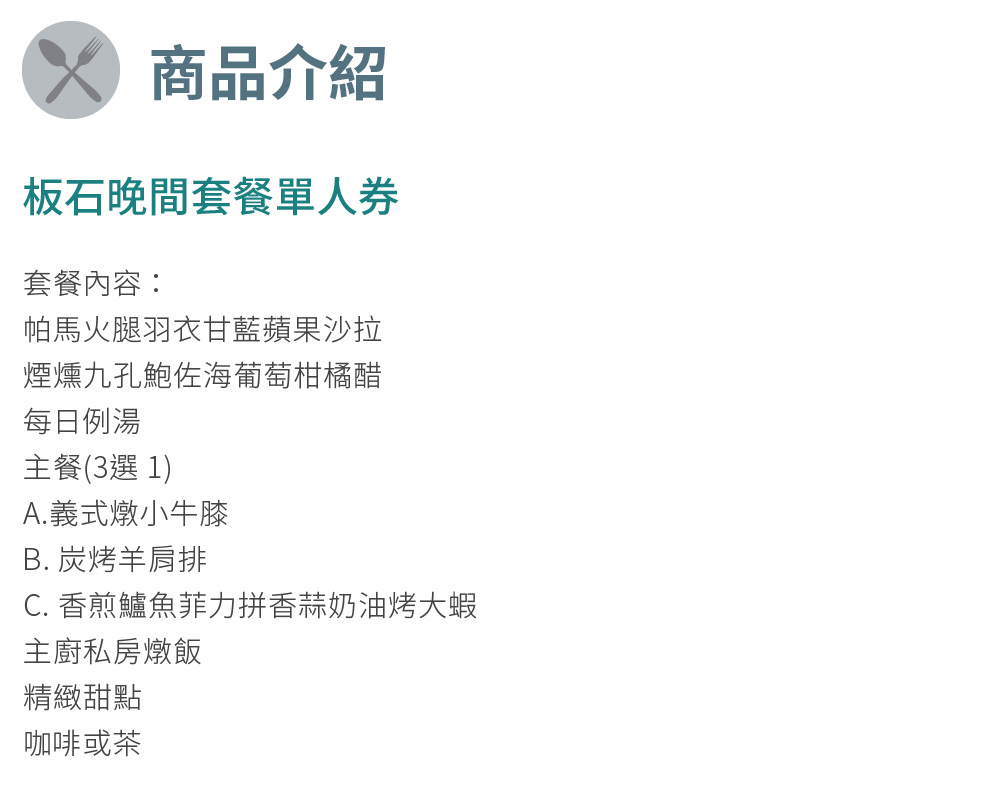 1. 本券可於【國聯大飯店】平日晚餐時段18:00-20:30兌換板石平日晚間套餐單人券。